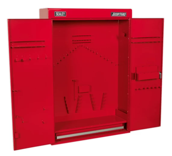 - Inside are assorted hooks to help organize tools and a full width slide drawer.