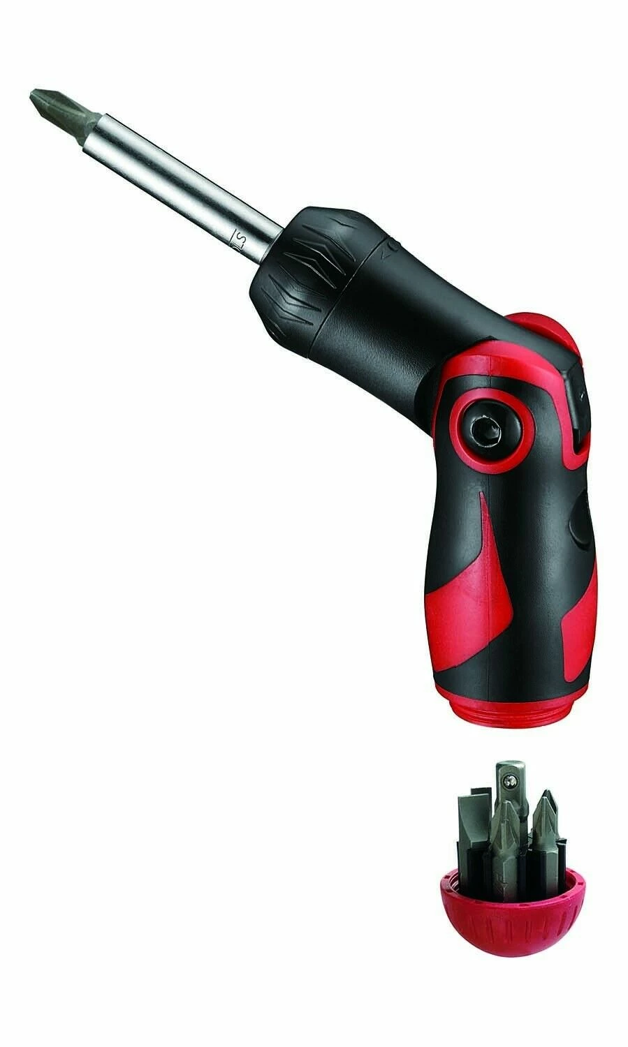 Features a jointed bi-material handle with storage for bits which can be offset at up to 60° to create a pistol grip handle for added torque.