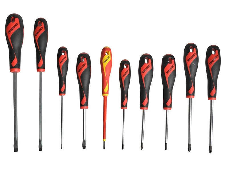 A set of 11 screwdrivers covering all the most commonly used sizes in flat/regular, PH and PZ . The screwdrivers feature TT-MV PLUS steel blades and ergonomically designed bi-material handles with a hanging hole that can also be used to make a T drive for added torque and comfort. Includes 5 flat blade, 2 PZ type and 4 PH type screwdrivers.
