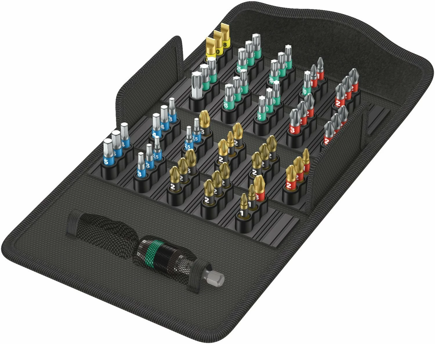 Wera Bit-Safes feature a compact design to safely store bits and holders in a handy structured fabric case; the tools are easily accessed. Drive and size are colour coded for easy selection of the right bit. 61 piece set.