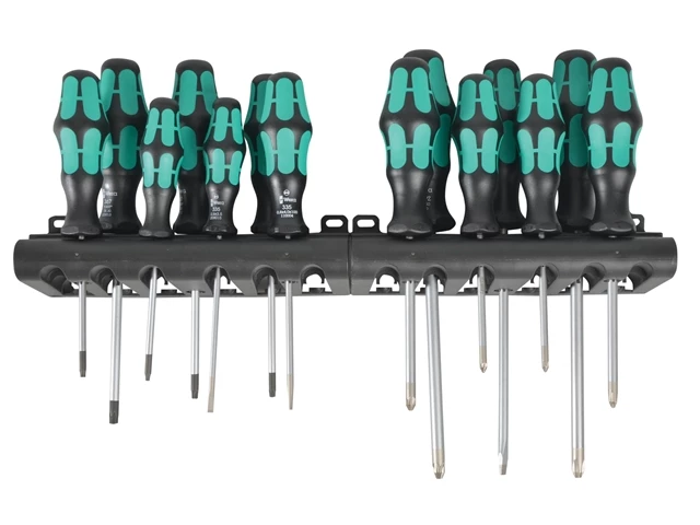 Supplied in 2 wall mountable storage racks, each screwdriver is marked on the end of the handle for quick identification of the type of screw it is suitable for. The contents of the set are: