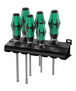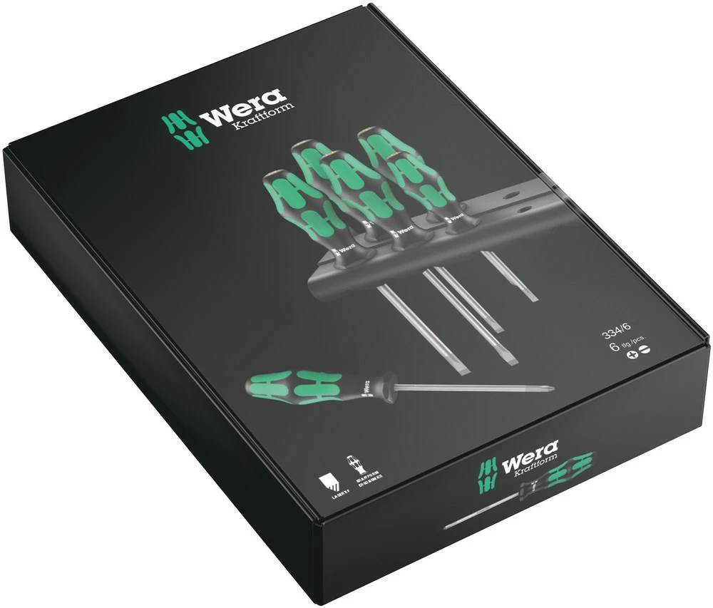 Wera Kraftform Plus 334/6 screwdriver set with chrome plated and hardened steel blades. The Wera Lasertip tip bites into the screw head, reducing cam out (prevents slipping out of the screw head) and eliminating the need for two handed screwdriving.