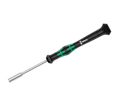 An electronics nut spinner / runner socket screwdriver with the Kraftform® micro handle with anti-rolling, hexagonal shoulder protection and rotating cap fitted with a multi-component, ergonomic grip. The round blade is manufactured from round, matt nickel and has a DIN 8320 specification tip.
