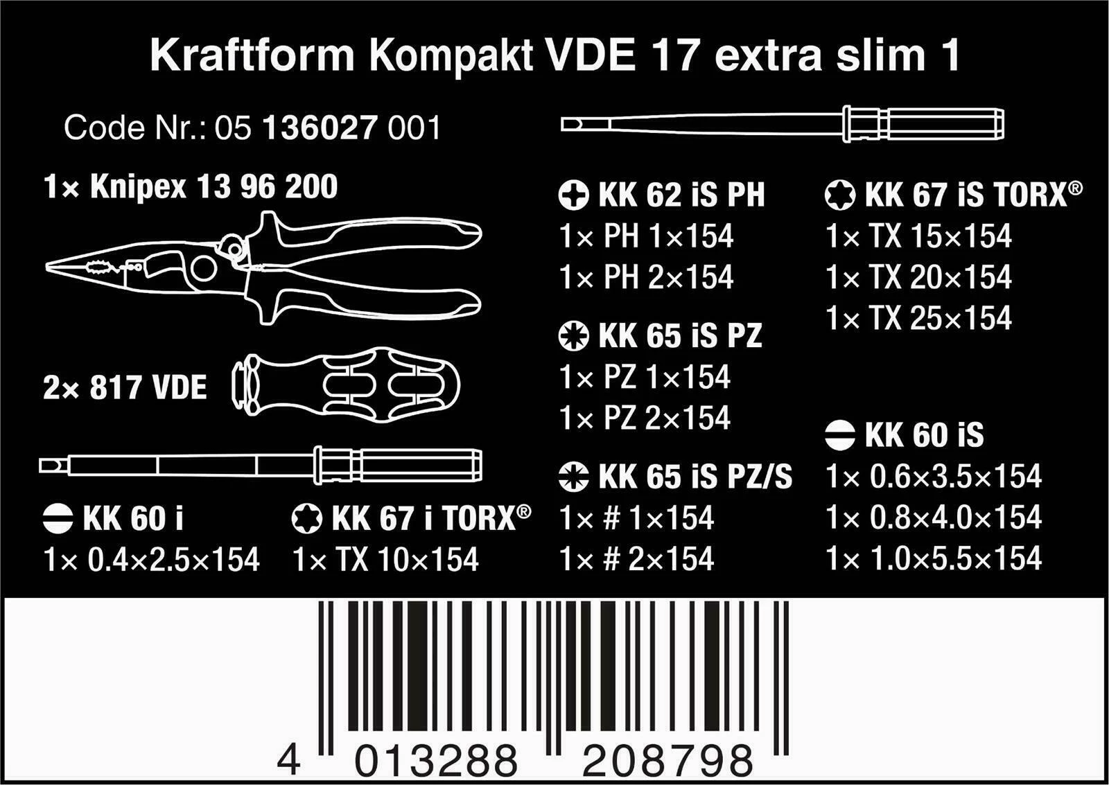 - 14 VDE interchangeable blades (each 154 mm long) with reduced blade diameter (articles KK 60 i 0,4×2,5 and KK 67 i TX 10 conventional diameter), so that sunken screws and spring elements can be accessed and actuated.