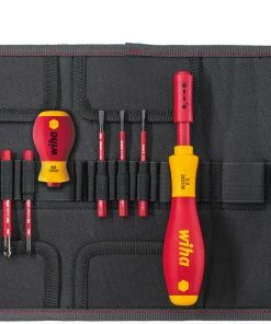 The 41233 from Wiha is a slimVario Insulated screwdriver and bit set. It is flexible, compact and mobile. All tools securely arranged in a robust and clearly laid out bag. Extensive interchangeable blade system saves space.