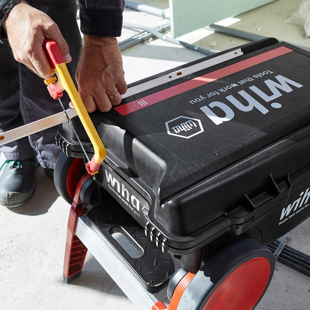 Thanks to the extra large wheels, it is easy to pull the case behind you on rough terrain or over stairs. Thanks to the fold-out legs, the case also serves as a non-slip step. In addition, the elevated position makes it comfortable to take out the tools, which is easy on the back.